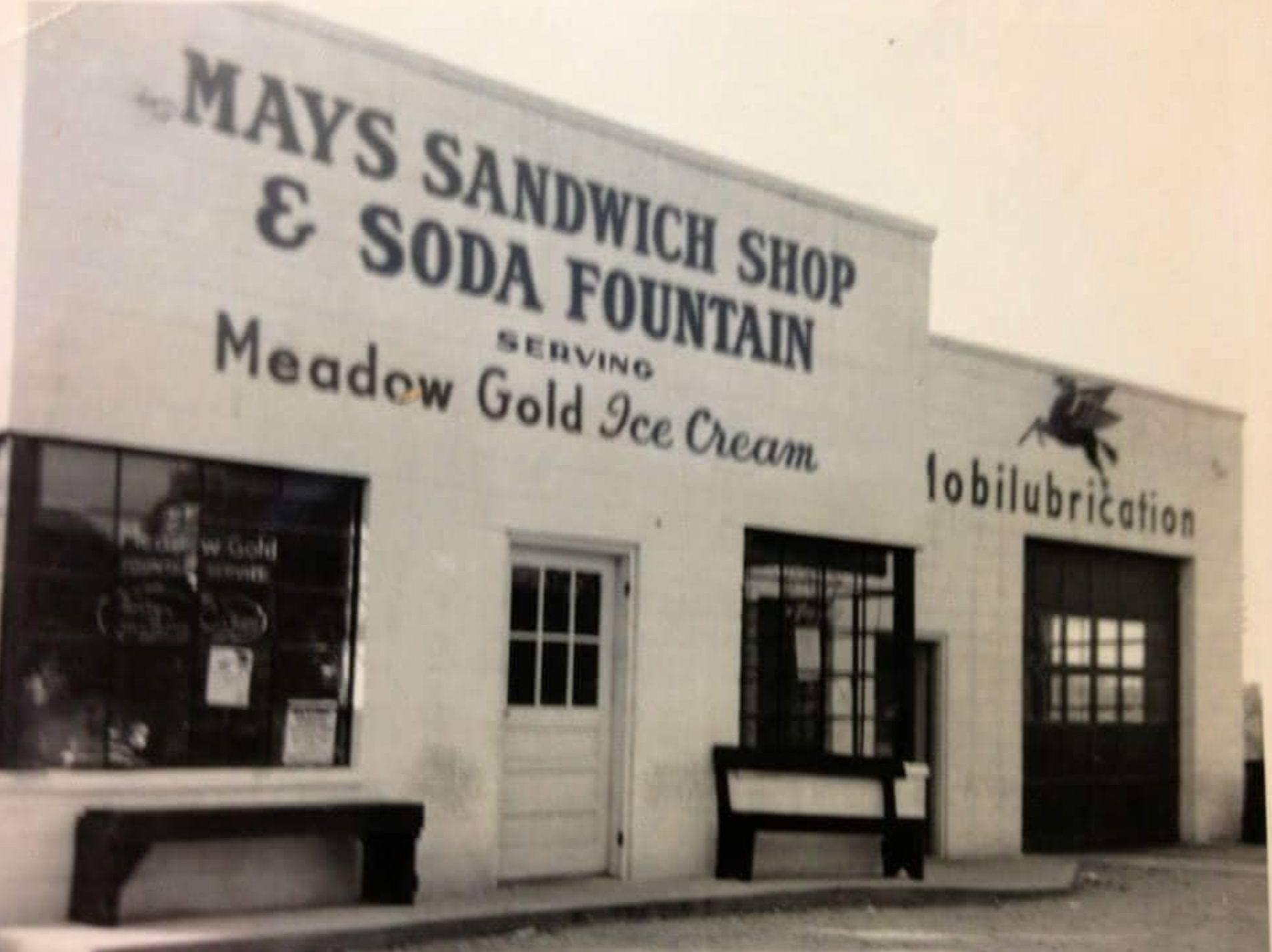 It was once known at Mays Sandwich Shop & Soda Fountain, which also had a Mobilubrication attached.