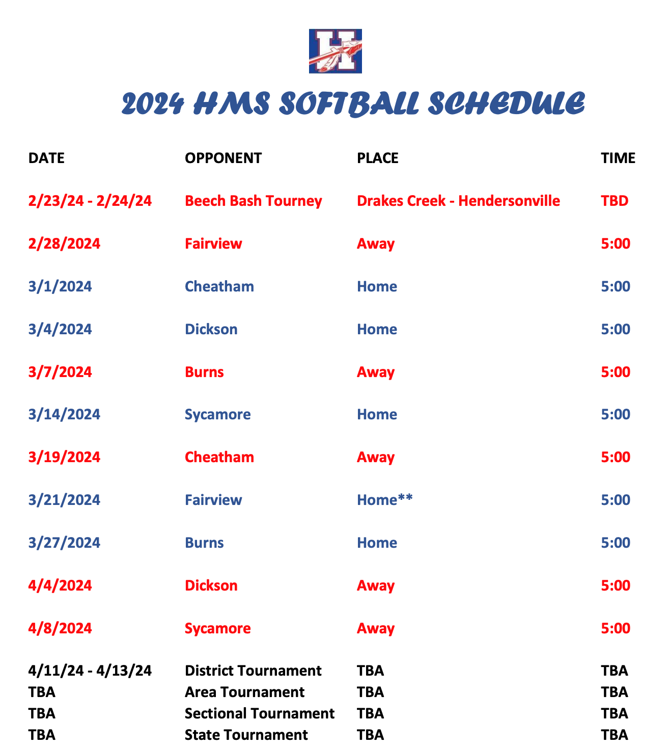 Spring sports schedule at HMS